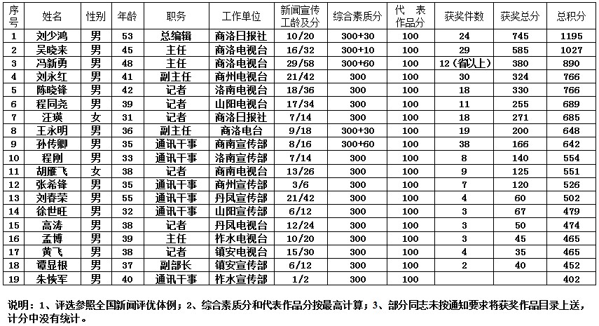 商洛市2012年省市優秀新聞工作者評選工作,于今2月12日開始,首批按時按要求上報的14位侯選人參加了省優秀新聞工作者聯評,劉少鴻同志以1195分位居第一,成為我市報送省優秀新聞工作者人選,3月30日已報省記協,省評工作正在進行。之后,第二批參評市優秀新聞工作者人選上報。近日,經初評以下19名同志為2012年商洛市優秀新聞宣傳工作者。定評會將于6月舉行,記者節進行表彰。