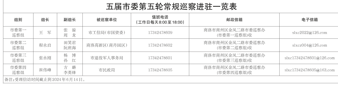 經(jīng)市委批準(zhǔn),2024年5月21日至6月19日,市委派出4個(gè)巡察組,對市工信局(市國資委)、商洛高新區(qū)(商丹園區(qū))、市退役軍人事務(wù)局、市民政局共4個(gè)部門(單位)黨組織開展常規(guī)巡察。