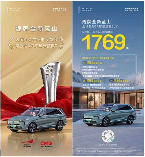 近期,魏牌全新藍山迎來了“雙喜臨門”——不僅成功入圍中央廣播電視總臺第五屆《中國汽車風云盛典》,成為榜單中唯一一款國產新能源中大型大六座SUV,還在市場端交出了周銷量(12.16-12.22)1796輛的優秀成績單,周周連漲,從權威認證到細分市場一路長虹,魏牌全新藍山以雙重實力證明了其在新能源SUV市場中的強勁競爭力。