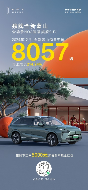 自上市以來,魏牌全新藍(lán)山銷量持續(xù)突破,連續(xù)四個月銷量突破6000輛以上,12月銷量再創(chuàng)新高勁銷8057輛,成為30萬級全場景NOA智慧旗艦SUV不二之選。魏牌全新藍(lán)山勢不可擋的銷量增長,充分展現(xiàn)了市場對其的熱烈追捧和高度認(rèn)可,也讓我們對魏牌全新藍(lán)山銷量破萬充滿了期待。
