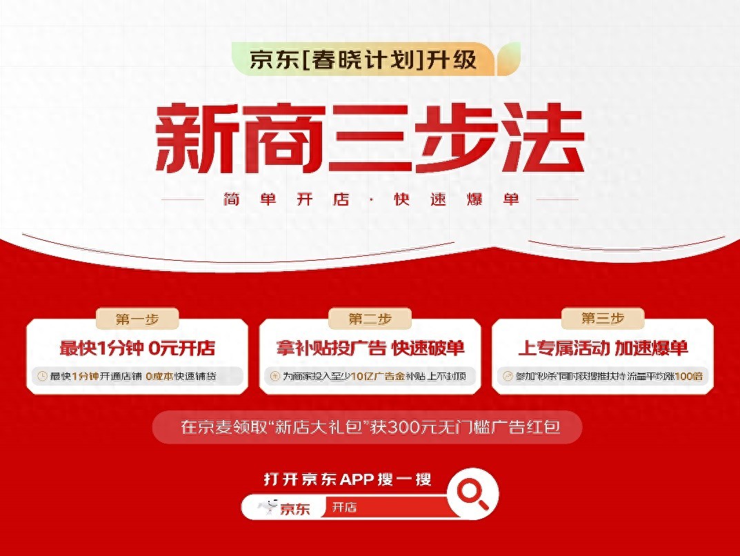 近日,京東宣布升級“春曉計劃”,重磅推出“新商三步法”,包含“ 0 元開店、拿補貼投廣告、上專屬活動”三大步驟,為新商家提供了簡單、明確、有效的開店指南,新商家只需跟著步驟操作,即可快速起量、加速爆單。