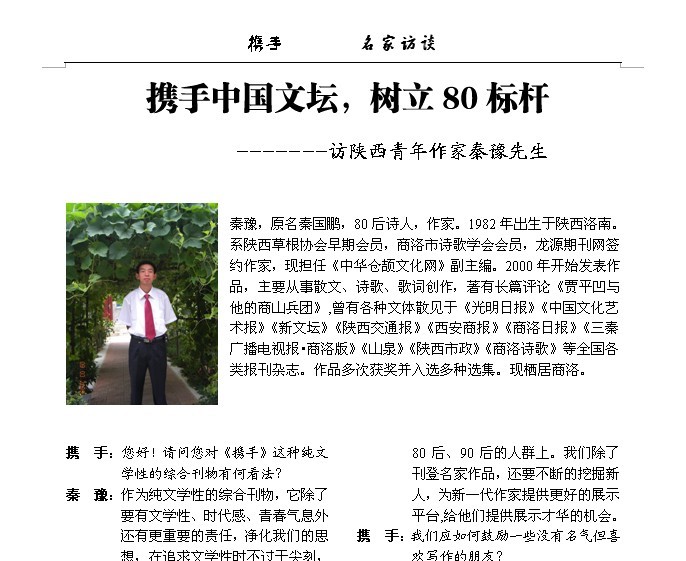 9月11日,商洛市詩歌學會會員、陜西草根協會早期會員、新生代80后作家、中華倉頡文化網副主編秦豫(秦國鵬)先生應邀做客《攜手》名家專訪?!稊y手》雜志主編,攜手青年作家協會主席海鵬先生擔任了本次專訪的總顧問。先將采訪現場實錄于下,敬請關注,以饗讀者。