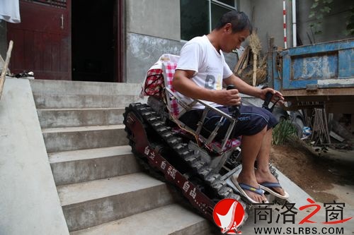 設計完成后,周建國做了一次試驗,看自己“傳輸帶”的大膽的想法是否經得起考驗。他找來一塊木板,在上面釘上一個三角帶,掛在自己家的臺階上,人站在木板上,發現臺階能負得起這樣的重量才放下心來。初戰告捷,為周建國增加了信心,他開始制作電動輪椅。然而,制作的過程遠比他想象的艱難得多。材料是一個大難題,因為沒有錢,所用的材料大部分都是從家里找或是從廢品收購站找,有時候一個零件十天八天都找不到。為了找到合適的電機,他跑遍城里所有的電動車銷售點;找不到剎車性能好的碟剎系統,他跑到自行車行托人家從廠家直接訂購,但由于廠家沒貨,最后他和人家商量把自行車行出售的自行車的剎車系統卸下來,多加20塊錢賣給他;設計也在制作過程中不斷地修改,剛開始設想用鐵鏈式的傳輸帶,后來考慮到電動輪椅經常上下臺階會把臺階磨損,換成了橡膠的;以前設想用摩托車的發動機,后來考慮到電動輪椅要開回家,會冒煙,就改為電瓶。為了省錢,兩個橡膠傳輸帶是他從廢品回收站買回來的舊輪胎,自己用刀割出與臺階能卡住的小三角。大夏天,他光著膀子汗水直流,橡膠異常難割,用兩三下就得磨一下刀,手上磨出了泡,兩條胳膊酸痛不已,他一坐就是一整天,用了4天的功夫,終于啃下了這塊“硬骨頭”。沒錢買車輪,他四處尋找合適的木頭,自己動手做了10個輪子;輪椅上的鐵架都是他一點一點地用角磨機刻、磨做出來,用了近30片角磨機片;為了弄好線路,他跑到電動車專賣店里專門學習,回家自己摸索……就這樣,今天拼一點,明天做一點,經過兩年的功夫,今年5月份,周建國的電動輪椅終于問世了。