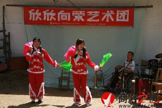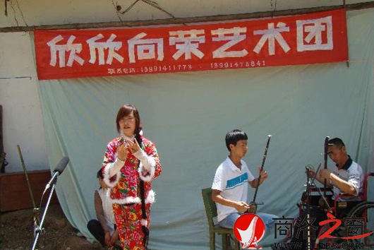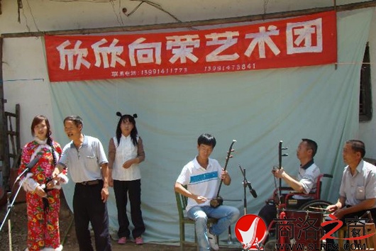 坐在輪椅上,寇志鋒最割舍不下的還是陪伴了他幾十年的那把板胡,他想重新操起這個(gè)能給家里帶來(lái)零花錢的營(yíng)生。于是,在區(qū)文化館的鼎力協(xié)助下,今年3月,一個(gè)由寇志鋒擔(dān)任團(tuán)長(zhǎng)兼策劃、指揮,大哥寇志彥、二哥寇春彥、女兒寇向榮為骨干成員的“欣欣向榮藝術(shù)團(tuán)”正式成立了。女兒寇向榮負(fù)責(zé)組織演員和聯(lián)絡(luò)演出事務(wù)。藝術(shù)團(tuán)平時(shí)保持在10個(gè)人,根據(jù)邀請(qǐng)方的需要,可臨時(shí)增加成員。節(jié)目以秦腔為主,配以歌曲演唱和舞蹈。慢慢地,“欣欣向榮藝術(shù)團(tuán)”在鎮(zhèn)里村間越唱越紅火。