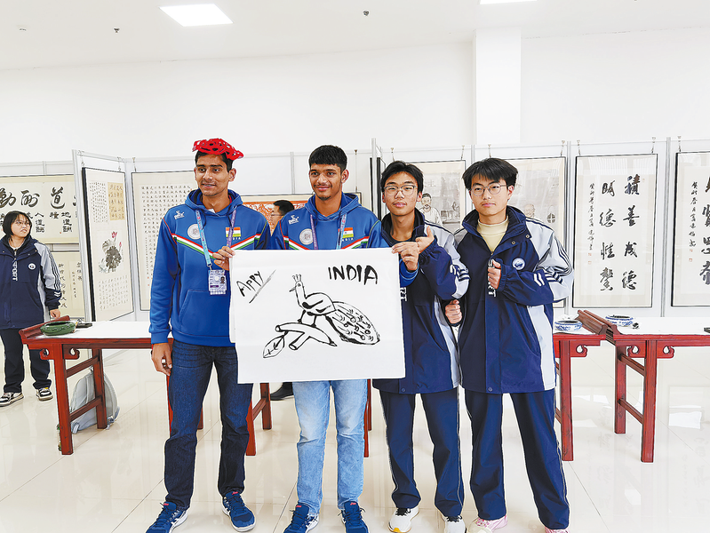 12月9日,印度隊(duì)員走進(jìn)商洛中學(xué),用毛筆畫下印度國(guó)鳥——藍(lán)孔雀,定格中外少年的暖心情誼。 (本報(bào)記者 景 康 攝)
