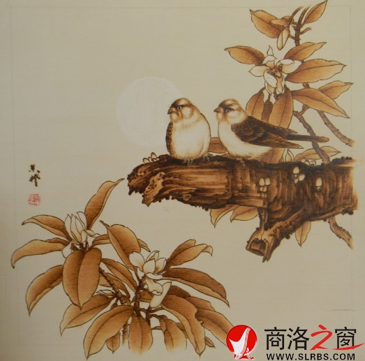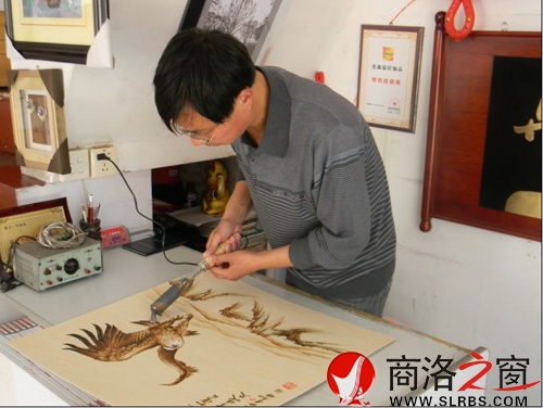 談起自己與烙畫的結緣往事,何世元不禁感慨萬千。出生在商州區夜村鎮的他,父母雙親是本分善良的莊稼人。或許是天賦使然,自小他就熱愛畫畫,孩提時代的他,畫里面充滿了童真,夜村的山水、自家的牛羊、自然中的花鳥,都是他筆下的可愛意象。受家中經濟的制約,兒時的何世元不像現代孩子,有專門的美術班可供選報,有專用畫紙和不同規格的畫筆使用,那時候的他寫作業用的都是一張能看的出秸稈的泛黃紙,就連這粗制的紙張都不是輕易能得到的。而這一切絲毫沒有影響到何世元畫畫的熱情,空閑時候的他用樹枝甚至是路邊撿來的小石頭,在家鄉的小路上開始最初的創作。