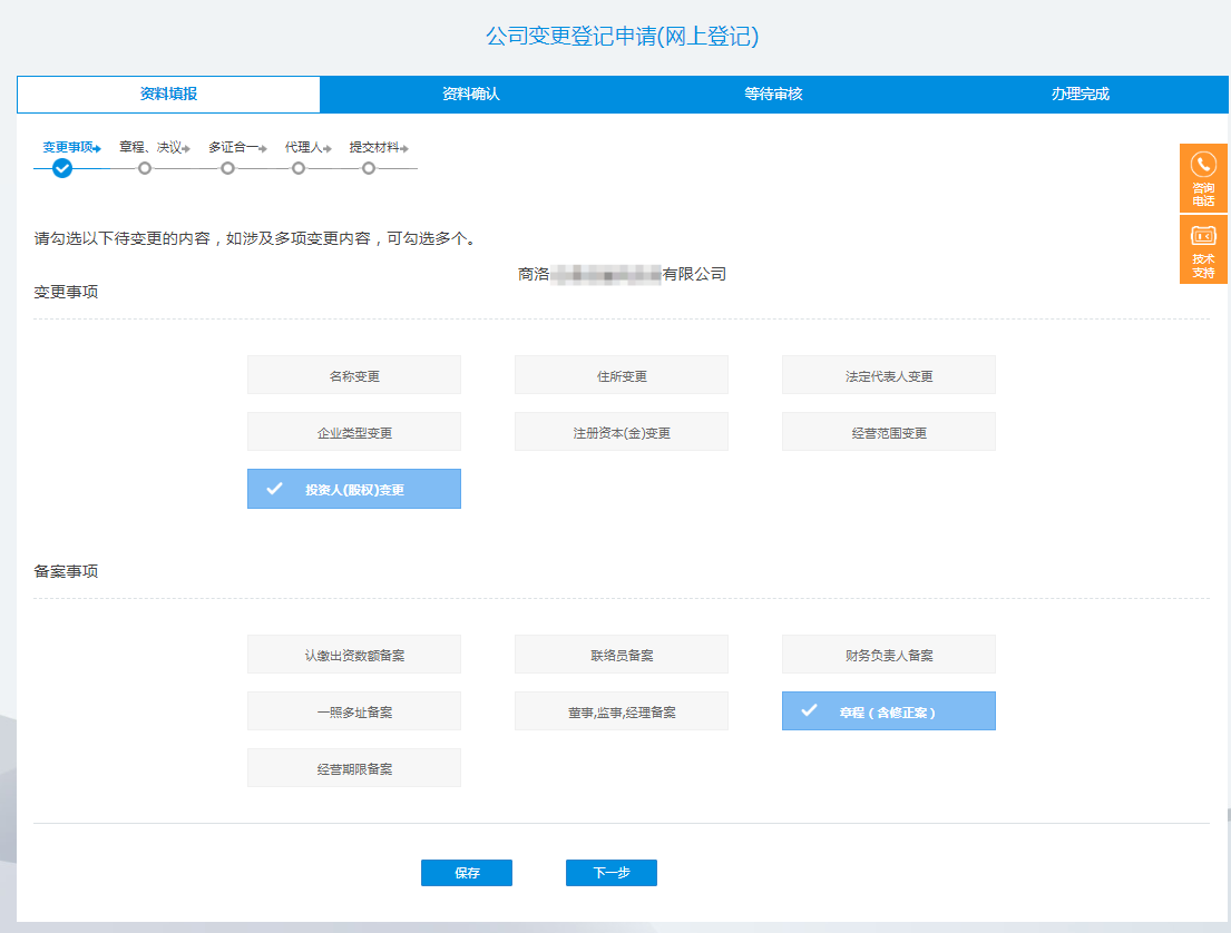 第四步:填寫(xiě)企業(yè)信息,勾選“投資人(股權(quán))變更”及“章程(含修正案)”,按照要求填寫(xiě)申請(qǐng),提交辦理。