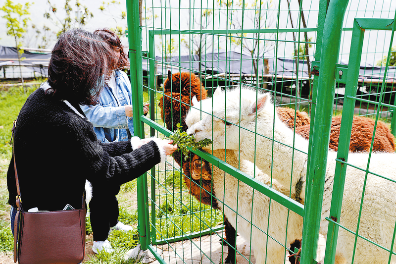 洲河北村現代林業產業示范園萌寵樂園里飼養的羊駝、孔雀、鴿子、兔子等萌寵小動物,成為游客打卡地。