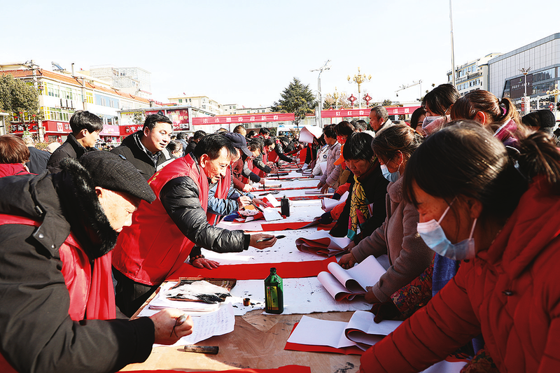 “內(nèi)外平安好運(yùn)來(lái),合家歡樂(lè)財(cái)源進(jìn)”“龍騰云海國(guó)昌盛,春滿人間民泰安”……一副副飽含祝福的春聯(lián),一張張遒勁有力的“福”字,伴著濃濃墨香躍然紙上。大家自覺(jué)排隊(duì)領(lǐng)取作品,個(gè)個(gè)臉上洋溢著幸福的笑容。當(dāng)天,書法家們共創(chuàng)作春聯(lián)、“福”字、書法作品800余件,全部無(wú)償贈(zèng)送給群眾。