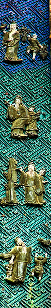 戲樓中額懸“秦鏡樓”立匾,正面主額橫匾題書“和聲鳴盛”,左右為一副木雕組畫楹聯(lián)。此木雕組畫楹聯(lián),遠(yuǎn)觀似8個(gè)字,近看是8幅畫。據(jù)《丹鳳縣志》記載:“‘和聲鳴盛’巨匾兩側(cè)有組畫拼成楹聯(lián)一副,然惜今已無人破譯。”這8幅畫組成的楹聯(lián)究竟是什么內(nèi)容?上百年來無人能解聯(lián)。有人曾將此聯(lián)拍攝放大,送到權(quán)威機(jī)構(gòu),請(qǐng)專家、教授研究破譯,至今無果。