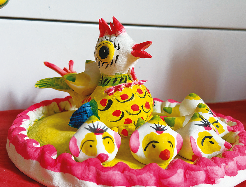 “那是我第一次現場制作面花,對我來說還是有一定難度的。”張廣新回憶,為了把仿真雞做好,他提前查閱資料,在制作過程中不斷修改完善,終于在有限的時間里,一只活靈活現的彩色雄雞在他手中誕生了。他的作品一經亮相,便吸引了觀眾的目光,人們紛紛駐足觀看,對他的技藝贊不絕口,同時也受到專家的高度評價,被譽為“陜南非物質文化遺產保護的后起之秀”。他精湛的技藝得到了丹鳳縣文化館的肯定,將他的作品在館內展出。