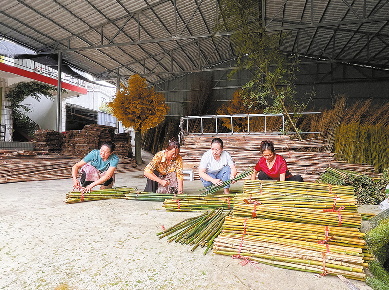 “我每天早上7點來到這里上班,中午11點回家為孩子準備飯菜,時間相對自由,一天能賺80多塊錢。”正在往竹莖上粘貼仿真竹葉的村民操建紅談及家門口的工作,感到非常滿意。
