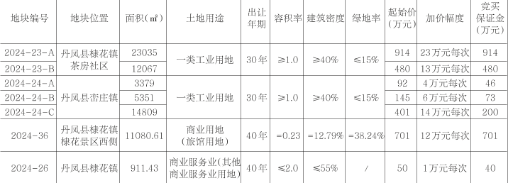 四、本次拍賣出讓的詳細(xì)資料和具體要求,見拍賣出讓文件。申請(qǐng)人可于2024年12月23日至2025年1月11日到丹鳳縣自然資源局一樓(丹鳳縣土地收購(gòu)儲(chǔ)備中心)獲取出讓文件。
