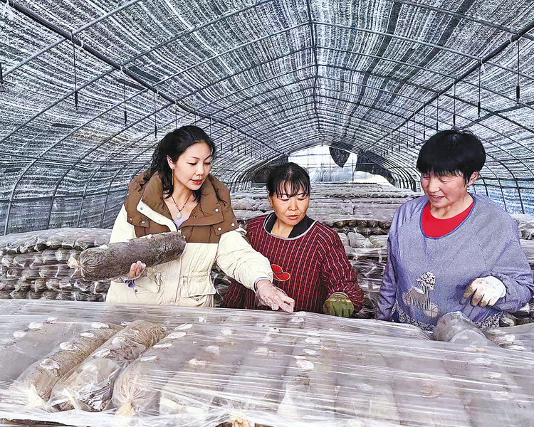 王婷指導(dǎo)工人管護(hù)滑子菇菌棒