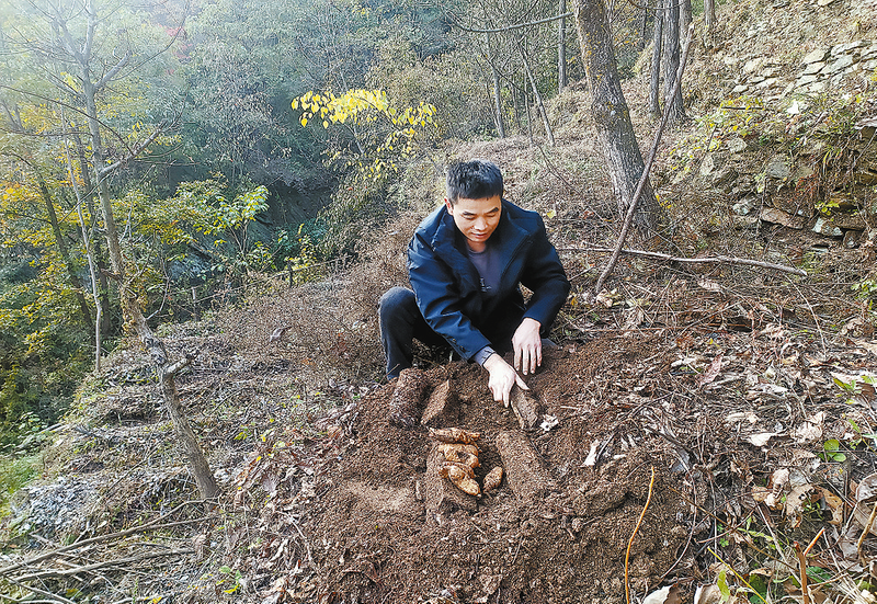 2024年12月24日,記者跟著天麻種植戶呂江軍一路上山,羊腸小道上落滿了櫟樹、槲樹的葉子,踩上去發出“沙沙”聲,在靜寂的山間響起了回聲。爬上龍王廟村呂家山組高高的山嶺,幾面山坡上的石坎地里,鋪滿了樹葉和草。呂江軍蹲下身,扒開地面上覆蓋的干草和樹葉,用一截樹枝拋開土,拉出一截椴木,泥土里面露出了白生生的天麻。他刨出一個大點的天麻,高興地說:“這一茬天麻有10來畝,長勢很好,今冬采收了,能賣10多萬元。我回來搞天麻這個路子走對了。”
