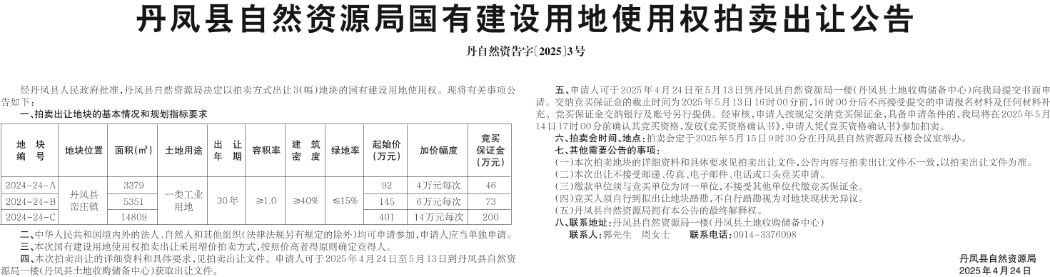 丹鳳縣自然資源局國有建設用地使用權拍賣出讓公告