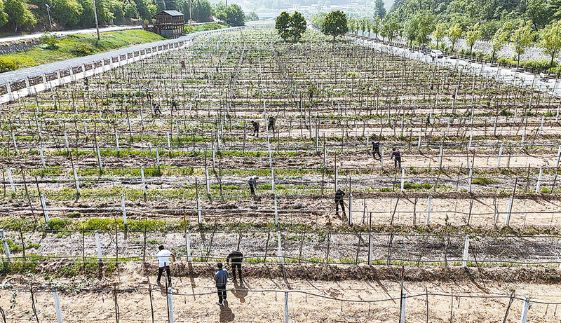 步入園區,獼猴桃藤蔓攀架成蔭,其下整齊排列的木耳菌棒已萌發菌絲。林間空地上,80多名工人正緊鑼密鼓地開展天麻零代種子播前整地。采用花粉種植技術,工人精準翻土、覆膜、布菌,確保土壤濕度與菌種分布均勻。