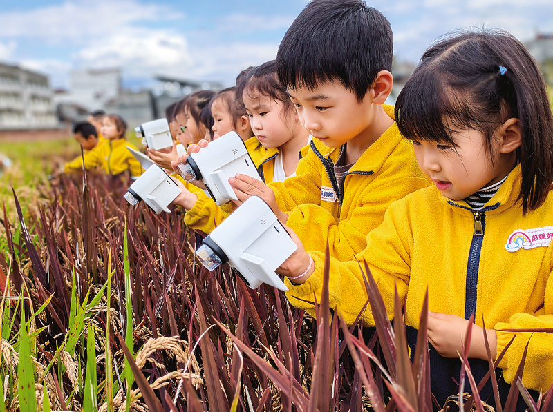在金色的稻田里,孩子們興致勃勃地觀察飽滿的稻穗,用放大鏡探索稻粒的奧秘,親手收集稻種,沉浸式感受“汗滴禾下土”的辛勞。農(nóng)技人員現(xiàn)場生動講解旱稻種植知識,帶領孩子們認識稻谷的生長過程,讓他們在實踐中領悟農(nóng)耕文化的深厚內涵。