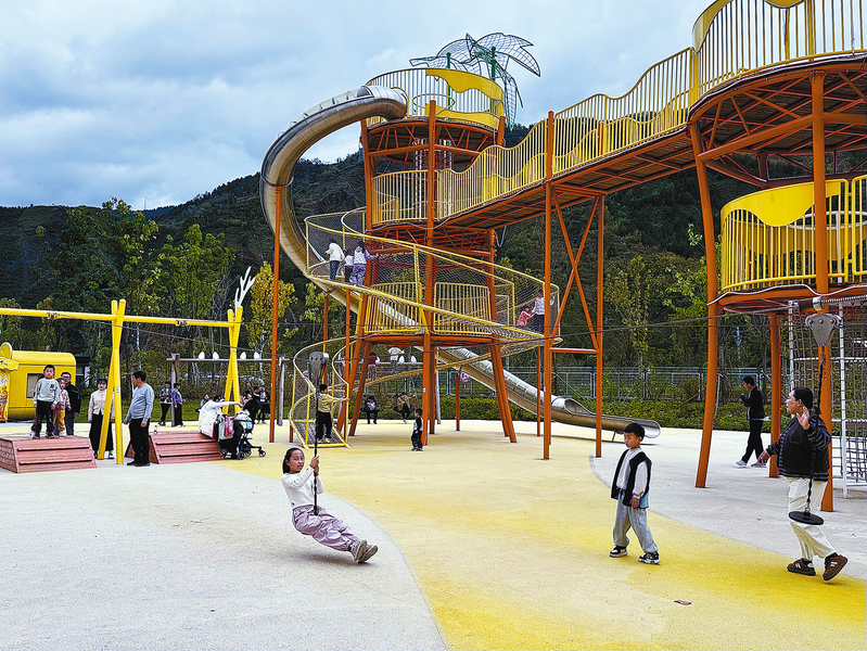 國慶假期后,丹鳳縣棣花鎮葡萄星球游樂場延續“免門票”福利,作為丹鳳本地特色文旅IP,此項舉措激活本地游市場,成為家庭周末出行的熱門選擇。圖為十月十九日,許多家長帶著孩子在游樂場里玩耍。(本報記者 謝非 攝)