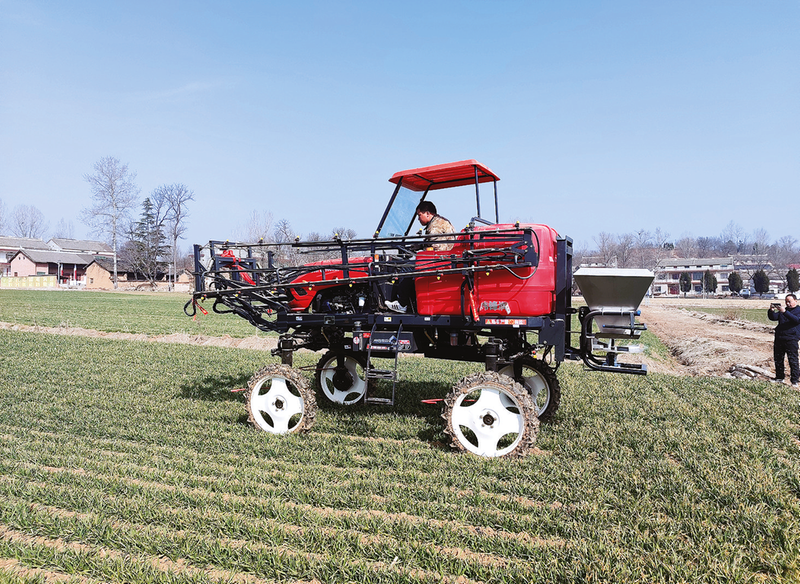 與此同時,加強麥田春管是提升小麥單產的關鍵。在古城鎮何村300畝小麥示范種植大田,一臺自走式噴桿噴霧機正在作業,格外引人注目。古城鎮雄風農機專業合作社理事長何超介紹:“咱合作社的這個自走式噴桿噴霧機是商洛市首臺,雙臂展開有16.5米,藥箱容量1000升,一次可植保小麥33畝。”