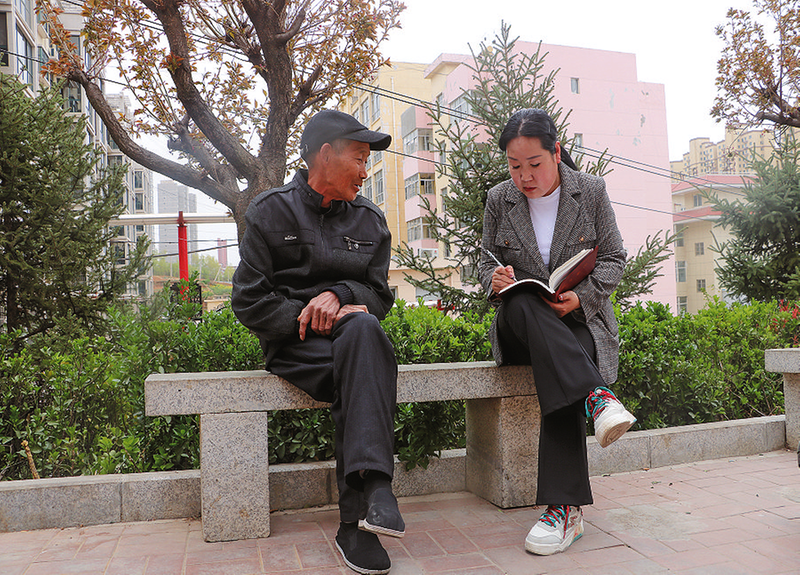 劉永明(右)在小區(qū)走訪群眾