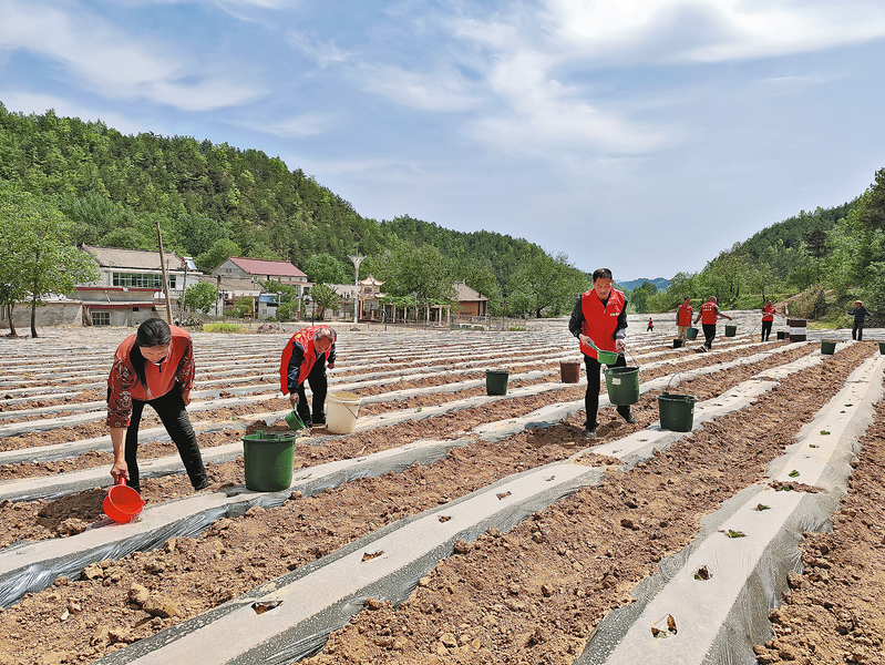 近日,洛南縣持續高溫少雨,農田旱情告急。面對嚴峻旱情,三要鎮楊川村聞“旱”而動,迅速組織群眾打響抗旱保苗攻堅戰。田間地頭,干部群眾齊心協力,通過科學調配水資源、積極引水灌溉等舉措,為干涸的莊稼送去“及時雨”,全力以赴守護豐收希望。圖為5月4日,縣人社局駐楊川村工作隊隊員與村干部深入下北溝組,幫助烤煙種植大戶挑水灌溉烤煙幼苗,以實際行動助力抗旱保苗工作。(本報通訊員 王建榮 攝)