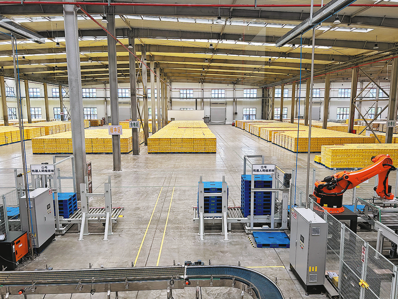 洛國蜂蜜水產業園建設項目倉儲車間內,一垛垛成品蜂蜜水整齊擺放在合格區位。