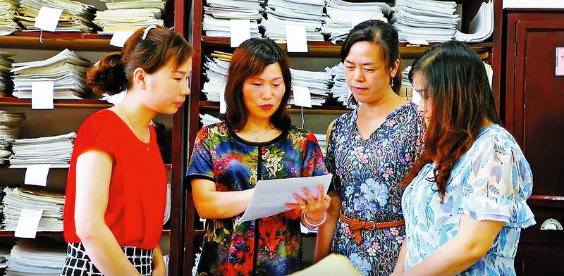 李曉燕(左二)為同事指導檔案管理工作