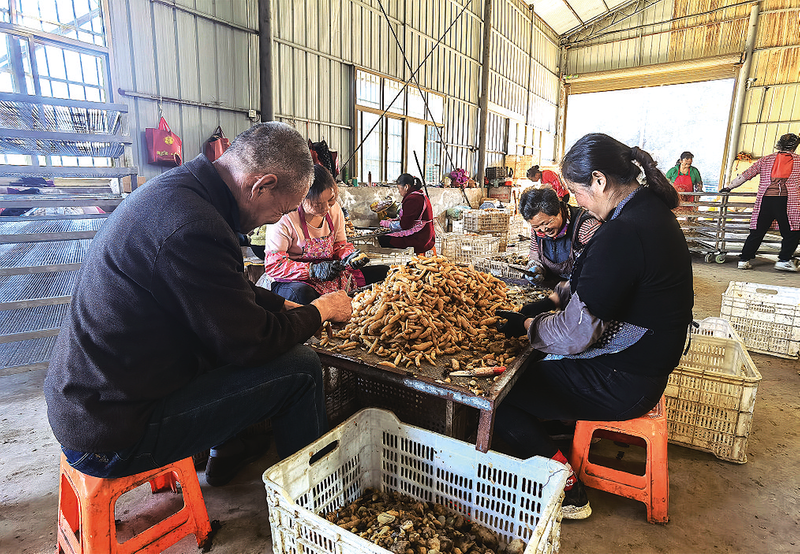 在團(tuán)坪村股份經(jīng)濟(jì)合作社天麻加工廠生產(chǎn)車間,工人們正把采收回來(lái)的鮮天麻進(jìn)行分揀、清洗、蒸煮、切片、烘干,現(xiàn)場(chǎng)十分繁忙。