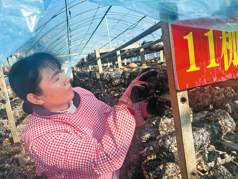 1月4日,商南縣金絲峽鎮(zhèn)二郎廟村村民李江粉正在大棚里采摘香菇。據(jù)了解,當(dāng)前全村種植香菇63萬袋,帶動(dòng)43戶村民年均增收3000元。 (本報(bào)記者 南 璽 攝)