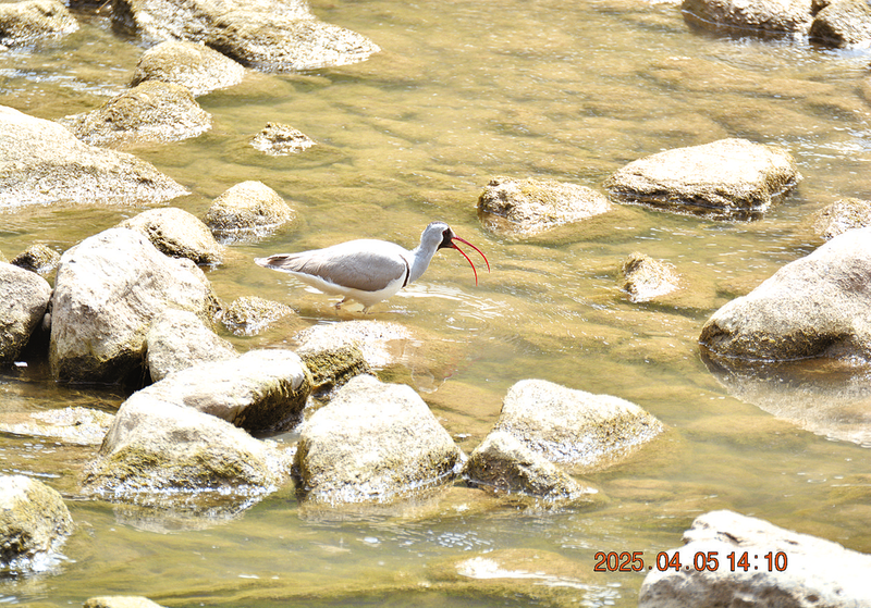 4月5日下午,調(diào)查團(tuán)隊(duì)沿山陽(yáng)縣金錢河徒步開(kāi)展鳥(niǎo)類觀測(cè)時(shí),突然聽(tīng)到持續(xù)的清脆鳥(niǎo)鳴聲,跟隨聲音仔細(xì)辨尋后,在一個(gè)由眾多小石頭構(gòu)成的河心島中發(fā)現(xiàn)了這只鹮嘴鷸。據(jù)悉,4月至7月為鹮嘴鷸的繁殖期,在4月初至4月中旬鹮嘴鷸雄鳥(niǎo)即開(kāi)始鳴叫和追逐雌鳥(niǎo),4月末5月初開(kāi)始成對(duì)營(yíng)巢。本次發(fā)現(xiàn)的鹮嘴鷸即為鳴叫階段的雄鳥(niǎo)。