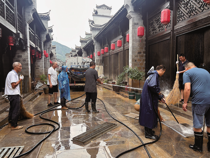 10日凌晨4時(shí),縣城管局抽調(diào)30多人,帶著大型抽水泵,開著灑水車、吸污清洗車等趕赴漫川關(guān)。“作業(yè)的難點(diǎn)一是沒有施工圖,對(duì)地下排水管網(wǎng)分布不清楚,二是為了保護(hù)古街地面的花紋、地磚,只能動(dòng)用小型鏟車,通過手工探摸井蓋,開展淤泥雜物清理和地下排水管網(wǎng)疏通。”縣城管局局長(zhǎng)楊昌說,目前,他們已對(duì)全鎮(zhèn)污水管網(wǎng)和污水處理廠受損管網(wǎng)進(jìn)行統(tǒng)計(jì),并加急維修。
