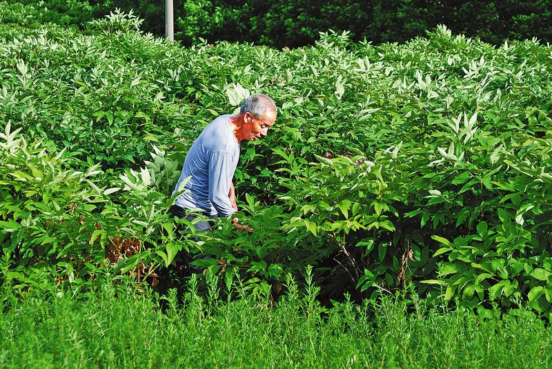 村民何建平在牡丹地里除草