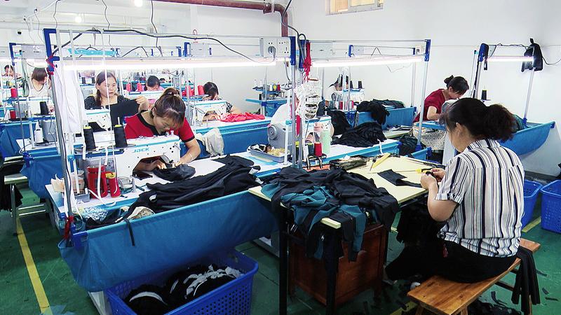 室外熱浪滾滾,室內卻是一片清爽。工人們井然有序地操作著機器,對手中的布料進行拷邊、熨燙、裁剪。公司負責人李建利來回巡視,不時停下來檢修機器、與工人們交流溝通。