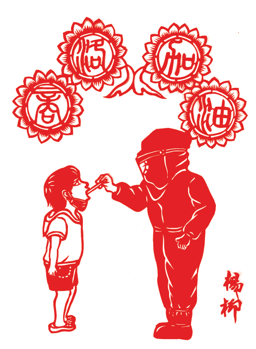 “作為高風險區的管控人員,我不能去一線為群眾服務了,那就首先要遵守疫情防控政策,做到足不出戶,不給大家添麻煩??吹结t護人員每日起早貪黑,居民積極配合做核酸檢測,各類抗疫人員堅守崗位、奮戰一線守護著家園,居家的自己能為抗擊疫情做些什么呢?想起那一幕幕感動人心的畫面,便萌生了創作戰‘疫’題材剪紙作品的想法。”楊柳說。