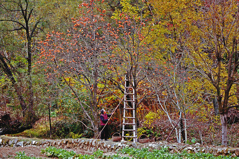 這些被村民高高掛起來進行晾曬的柿子,每個都已經被去了皮,將被制作成柿餅。去皮就是用傳統的手工去皮刀,將七八成熟的柿子表面削除。據村民介紹,柿子光滑的表皮具有一定的澀味,削除表層后通過晾曬、上霜,柿子更加甘甜可口、有韌性。