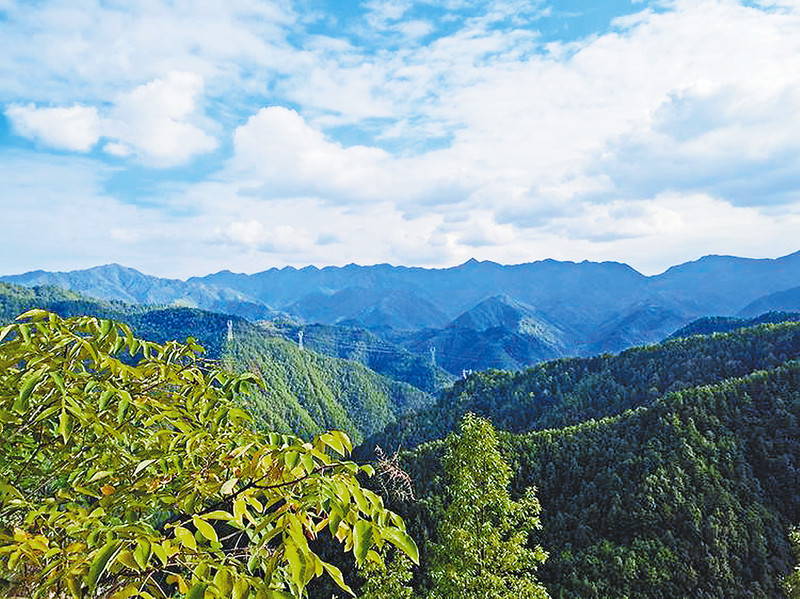沿著“之”字形的土路爬上半坡,沿途葛藤鋪滿山坡,像一塊塊綠毯子。眺望遠(yuǎn)方的流嶺山脈,那個(gè)尖尖的山峰就是天寶寨。俯瞰腳下,重巒疊嶂,滿目蒼翠,河谷屋舍儼然。天空藍(lán)得醉人,空氣清新,令人心曠神怡。