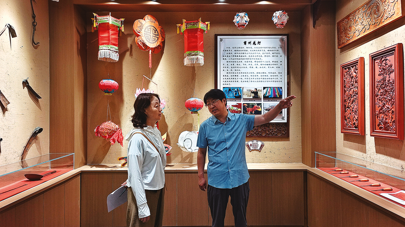 商州非物質文化遺產中心負責人一行走進秦嶺江山景區查看商洛木雕等非遺實物展示情況