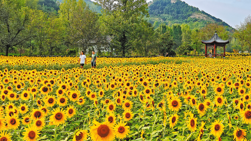 近日,商州秦嶺江山景區(qū)內(nèi)的油葵進(jìn)入盛花期,置身這片廣袤的花田間,仿佛步入了一幅田園畫卷中。圖為9月10日,游客在花叢中漫步拍照。 (本報(bào)記者 楊 鑫 攝)