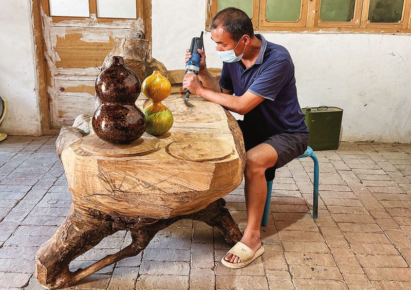 閆天龍10多歲就在家具廠干木工活,也懂漆器。他曾在北京待了10年,做家具美容。“家具見得多了,現(xiàn)在只要給我一張照片,我就能把家具上面的花紋都給做出來。”閆天龍自信地說,“我過幾天就又要去北京務(wù)工了,空閑時(shí)間我可以做大漆葫蘆,然后讓我老婆去舊貨市場賣,很值錢的。”