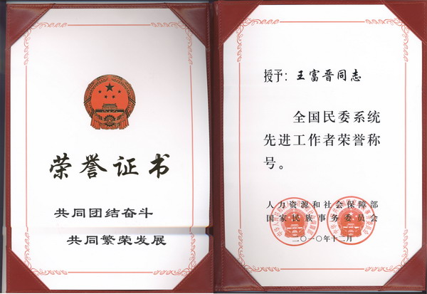 國家人社部和民委共同授予王富晉同志全國民委系統先進工作者榮譽稱號