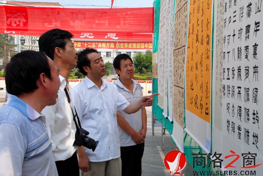 本網訊 6月29日,洛南縣政協在縣城中心廣場舉辦慶祝建黨90周年暨辛亥革命100周年書畫展,吸引了眾多市民前來觀看。展覽共分為中共黨史、偉人詩詞、名言警句、河山壯麗、紅色記憶五個部分,展出各類書法、繪畫作品157幅,表達了洛南各界人民群眾對黨的祖國的熱愛之情。(何勇/攝)