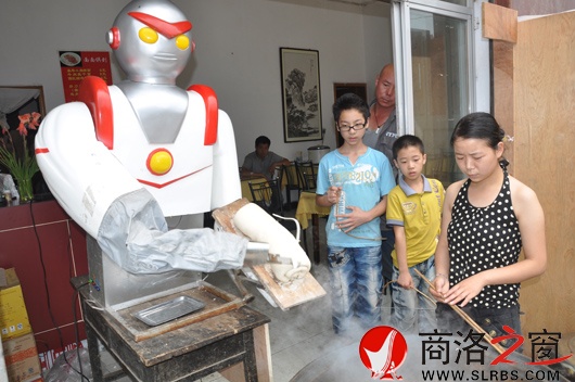 本網(wǎng)訊 近日,洛南縣一家餐館推出“機(jī)器人刀削面”,引來了諸多好奇的目光和絡(luò)繹不絕的食客。據(jù)經(jīng)營者介紹,削面機(jī)器人是他花費(fèi)兩萬元從北京購買的,因這位“伙計(jì)”削出的面長短薄厚均勻、口感勁道,吸引了眾多食客。(冀希亮/攝)