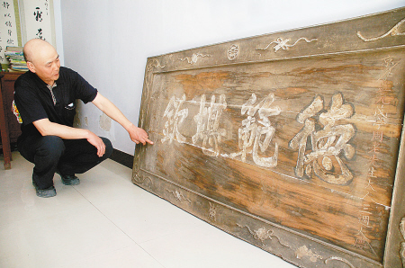 昨天(5月16日),記者在洛南縣城關(guān)鎮(zhèn)周村村民周喜財家中看到,這塊牌匾長約190厘米,高約95厘米,重約30公斤,因年代久遠(yuǎn)牌匾表面油漆、金箔已經(jīng)脫落,整個牌匾呈土黃色,但整體保存完整,牌匾上所題寫字跡清晰可辨,牌匾右側(cè)自上而下為“京學(xué)監(jiān)元茂亭周老先生大人三周大慶”,正文自右而左為“德范堪欽”四個大字。牌匾四角為蝙蝠形花紋,上下邊正中雕刻有立體感的琴、棋、書、畫圖形,兩邊也分別雕刻有立體感圖形。據(jù)周喜財講,該牌匾傳到他手中已是第五代,因“文革”期間家譜丟失,已無法考證五代之前先祖具體姓名,但聽爺爺講五代之前先祖周××為華陽中學(xué)(洛南中學(xué))創(chuàng)辦者。(作者 張紅中)