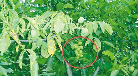 近日,在洛南縣柏峪寺鎮王村組一村民家的核桃園里發現一株結出18個核桃的“葡萄”型的核桃樹,在當地十分少見,引來不少游人觀賞。(西安晚報 張紅中 趙曉翔)