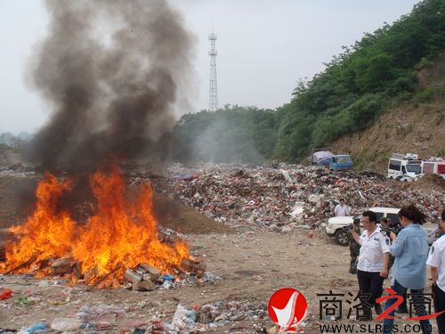 商洛日報訊(汪治 何祖華)為確保全縣飲食用藥安全,近日,商南縣食品藥品監督管理局聯合公安、消防、衛生、質檢等部門機構,深入食品藥品生產、經營單位開展假冒偽劣食品藥品檢查宣傳活動,強力打擊偽劣假冒食品和藥品的生產、銷售。圖為假冒偽劣食品藥品集中銷毀現場。