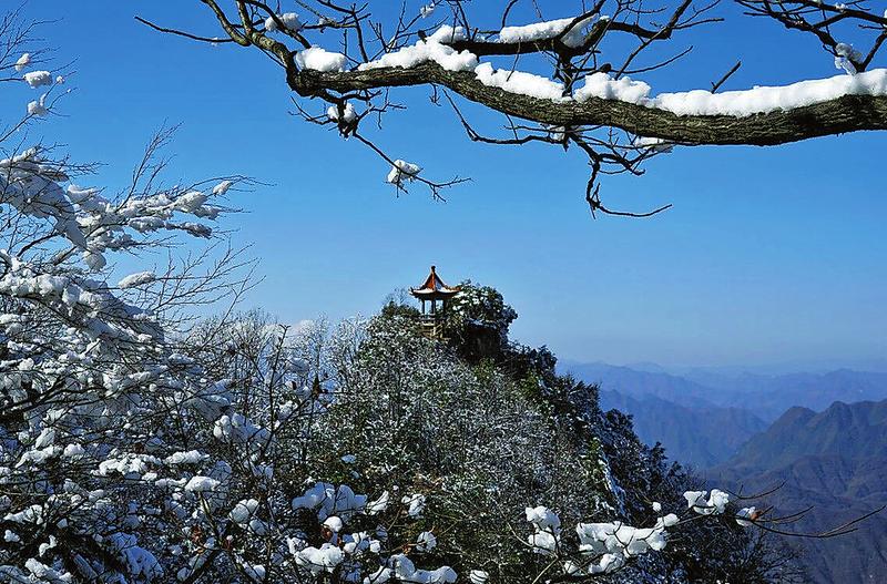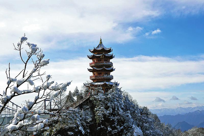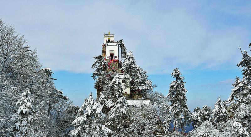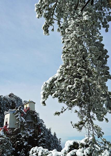 塔云山海拔1600多米,氣溫低,每當山下冬雨紛紛時,這里已是雪花飄飄,銀裝素裹。山上植被高達95%以上,到處是蒼松翠柏,使這里形成了千奇百怪的霧凇景觀。那落葉的樹枝突然變得肥胖,一棵樹就是一盆珊瑚奇景;那些沒有落葉的喬木、灌木,在冬雪的裝扮下開出棉花般的大團花朵;那歷經五百多年的道觀,被白雪悄然覆蓋,變得更加圣潔靜謐。在這潔白的世界里,塔云山的每一處景觀、每一個建筑,都是一幅水墨畫,讓人過目難忘。