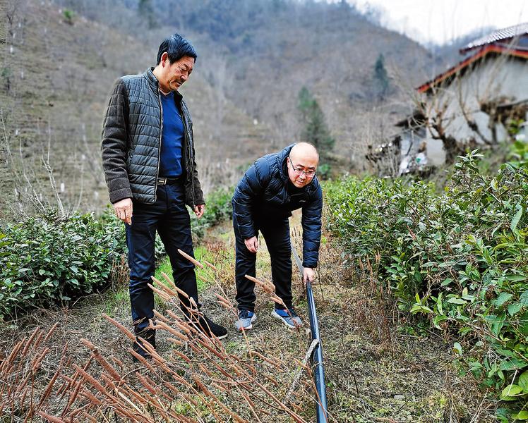 張樂來到郭興和家里,幫他查看茶園的灌溉管道