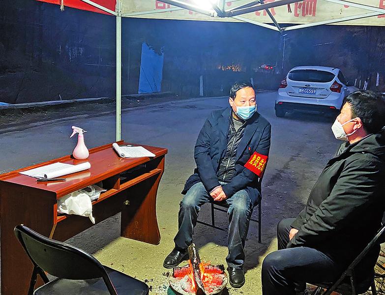 王衛東(左)和村干部深夜在疫情防控檢測點值守