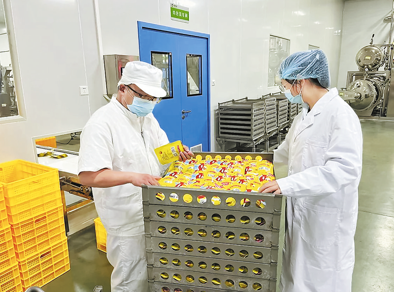 陜西合曼農業科技有限公司車間內,工人將罐裝板栗擺 盤,預備進殺菌釜殺菌。